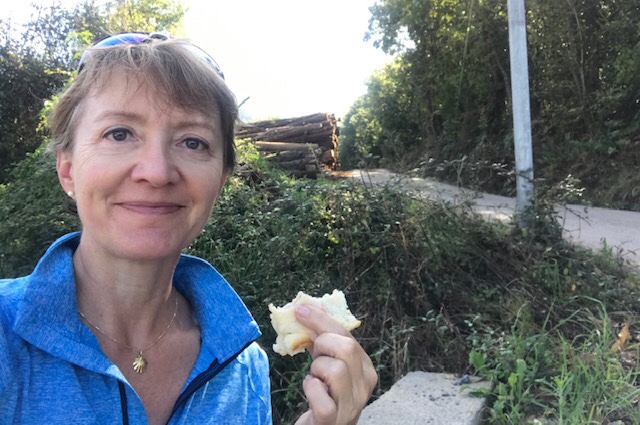 I stopped in a gutter by a stack of logs for a lunch break at 17 kms. Sometimes you have to take whatever seat in the shade you can find!