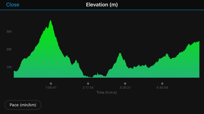 It’s all hills this morning: steep, level, gentle – all part of one big incline. I hope I’m wearing off yesterday’s huge lunch!