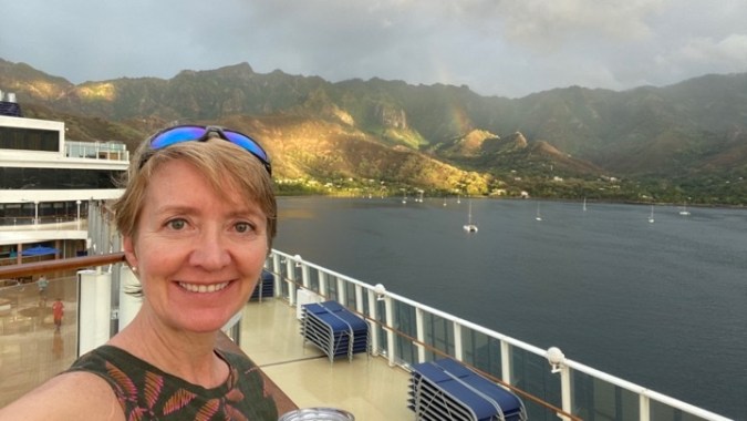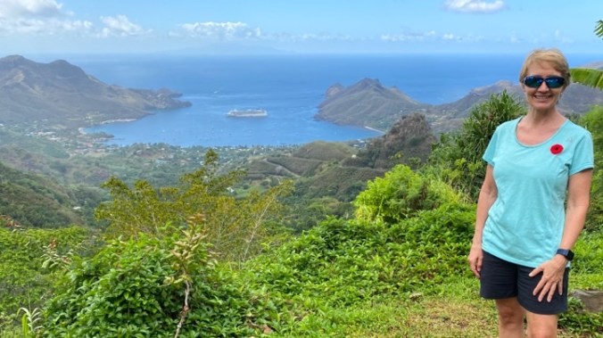 It was a short night last night! To bed at 11pm but up at 4:55am. I’m not sure what woke me, perhaps a change in the sound of the engines, but when I looked out my window I saw land! I ran upstairs to Deck 13 for a look and we’d arrived to the harbor of Nuku Hiva, Marquesas. Unfortunately it was a wet and still dark welcome so after 1-2 pics I headed back downstairs to get ready.