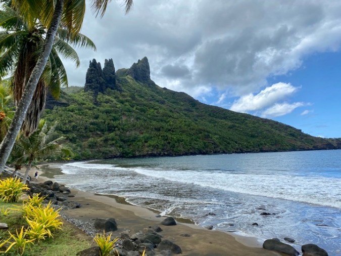 There’s no native vegetation suitable for consumption on the island. The first Polynesians brought coconut, fruit trees, and some animals with them and later visitors brought more such that the Marquesas are a leading producer of fruits for other islands. There’s no fringing reef so very few beaches formed and even at those most locals don’t swim at them as there’s a genuine danger of sharks.