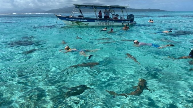 Our boat picked us up at the marina beside the cruise ship dock and we motored over to Taha’a to a offshore spot near the edge of the reef but still in shallow water to swim with the sharks. The blacktips were there waiting for us and continued to circle our 2 boats for as long as the guides discreetly threw out food. I finally got a fairly decent picture: