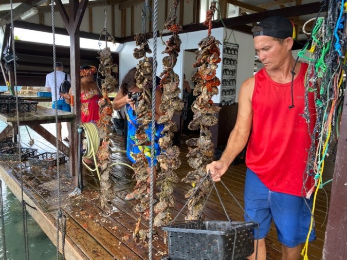 Next we motored up the beautiful west side of the island to visit a pearl farm. Learning about the whole cultured pearl process again was still fascinating. The Tahitian black-tipped oyster is the only one in the world that produces colored pearls, up to 178 shades! This farm has 90 hectares of farm, approximately 2 million oysters. We watched the whole process from seeding to plucking out the finished pearls.