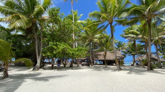 Lunchtime! So we went further round Ta’aa to dock at a deserted motu with a big palm-thatched open air building which had our delicious lunch spread. We were joined by another large tour boat so I think it’s a business independent from our snorkeling company. No matter, there was food and beach chairs for all. We had an hour after the meal to swim or soak up the sun.