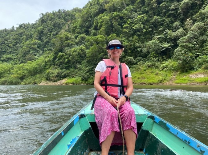 We prepped for our longboat ride by wrapping our gear in black garbage bags and donned colorful life jackets before being ushered in groups of 5-6 into our longboats for the trip to the waterfall. It’s just barely the start of the wet season so the river was shallow at some of the bends and we had to take a couple of goes to find deep water without bottoming out. After having to walk around one set of fierce rapids the Captain made me sit up on the bow facing backwards like a reverse figurehead to distribute the weight!![]()