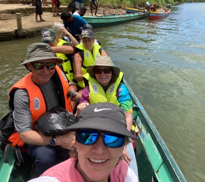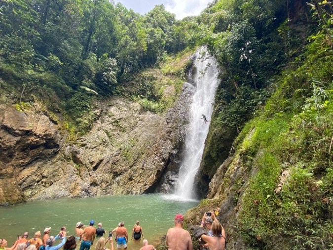 We reached the access to the waterfall which turned out to be a 10 minute length of concrete built along a gushing river to a huge waterfall. Most passengers soaked themselves in the pool below, some went under the falls to get pummeled, and everyone watched the 2 village boys who climbed up the jungle slope to leap into the pool below. Alas I didn’t bring my swimsuit but I was content to watch everyone else frolic.
