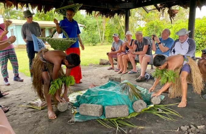 Back to the town hall for a introduction to mat weaving and tapa cloth printing before having our buffet lunch. Curried lentil soup, pit-baked chicken and mahi-mahi, taro, curried vegetables, a vegetable noodle salad, and fresh fruit rounded out the meal.