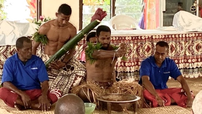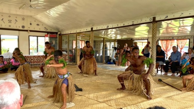 It was a long 45 minute drive from the port to the village where today’s activities take place. We initially gathered in the Village Hall for a cava ceremony and dancing, some directed at us and some with us. The ceremony is meant to welcome visitors as well as honor the important village members and features an intoxicating brew of cava root mash. It apparently tastes like dishwater so fortunately only 2 chosen cruise ship passengers represented us all.