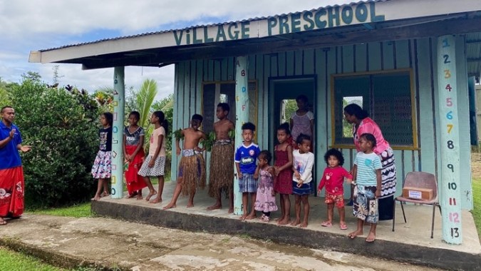 Afterwards we walked across the village square to see the bbq pits where our lunch was being cooked and subsequently uncovered from its cloth and leaf ovens. The village boys carried it away to be divvied up and we moved over to the Preschool where the local children sang a little song for us. It all could have been a bit hokey but everything actually felt genuine and welcoming.