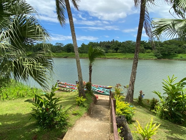 Back to the town hall for a introduction to mat weaving and tapa cloth printing before having our buffet lunch. Curried lentil soup, pit-baked chicken and mahi-mahi, taro, curried vegetables, a vegetable noodle salad, and fresh fruit rounded out the meal.