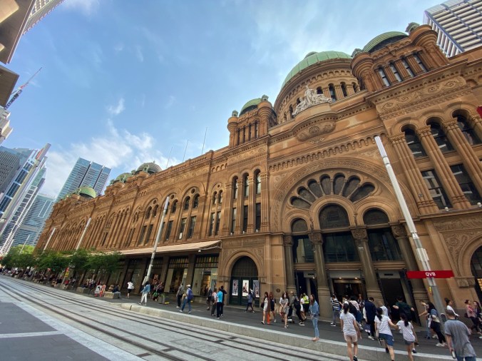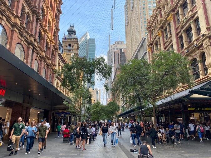 Not only did I find a cheap sweatshirt, I found all the people! They’re doing their Black Friday shopping on Pitt Street. And I found the food marts! Who’d guess they be down by the clothing shops? A few blocks of craziness was enough so I cut back over to Macquarie Street, the long street with Hyde Park, the Botanical Gardens, and historic buildings, to stroll back to my hotel.