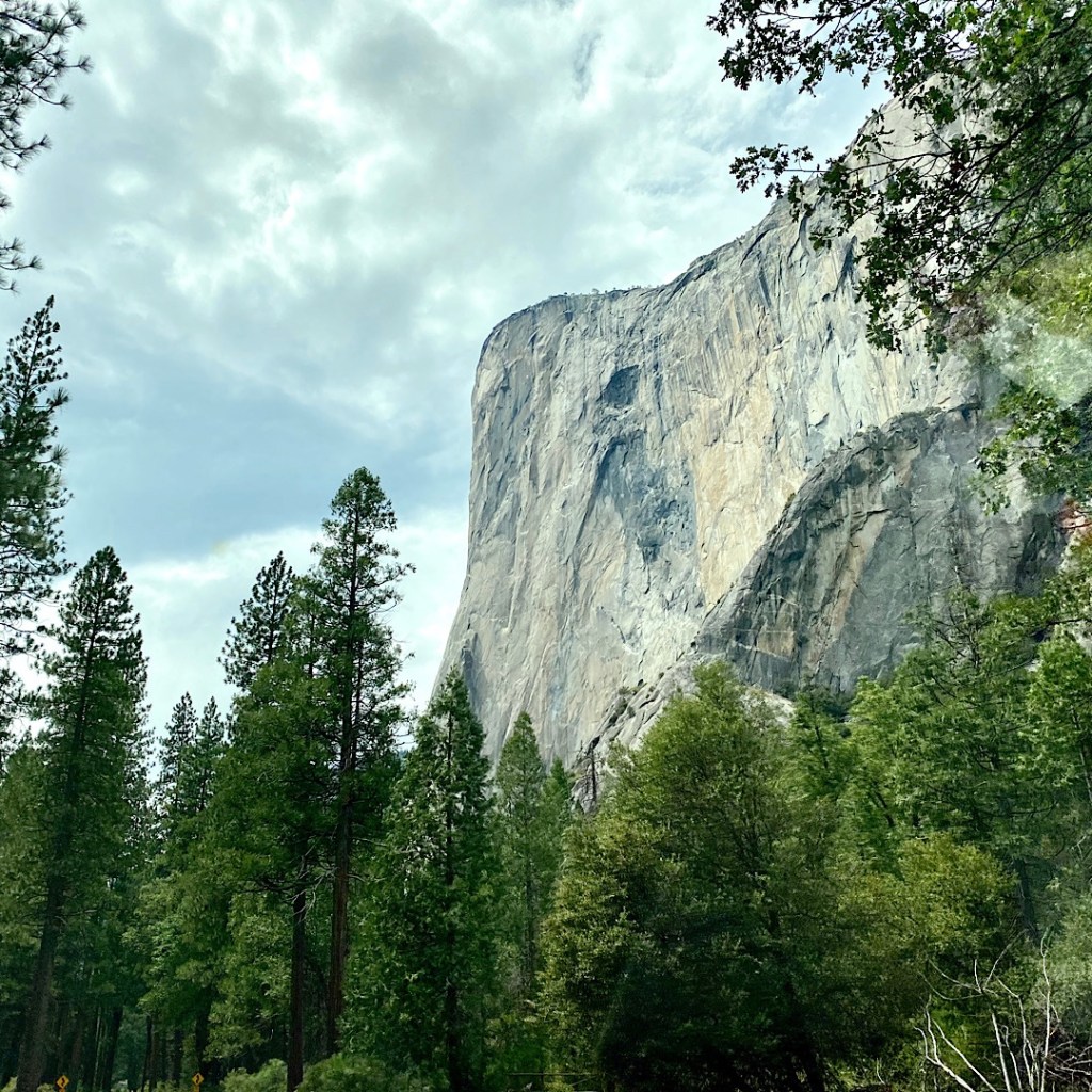 Just beyond the bike loop, driving out of the valley, one passes the legendary El Capitan. There were lots of cars parked on the roadside with their occupants staring up at it, trying to spot climbers, but I couldn’t see any. Looking at the sheer magnitude of vertical face of it, I have to think anyone attempting to climb it is insane!