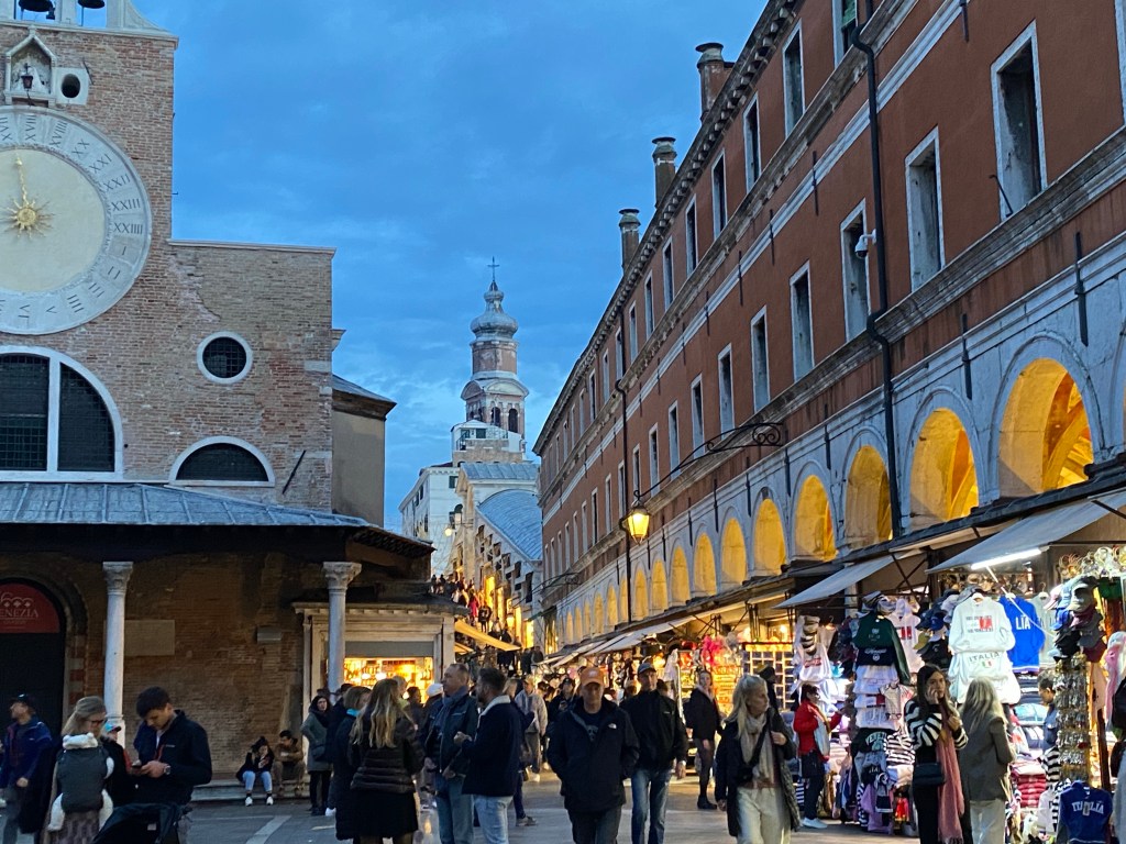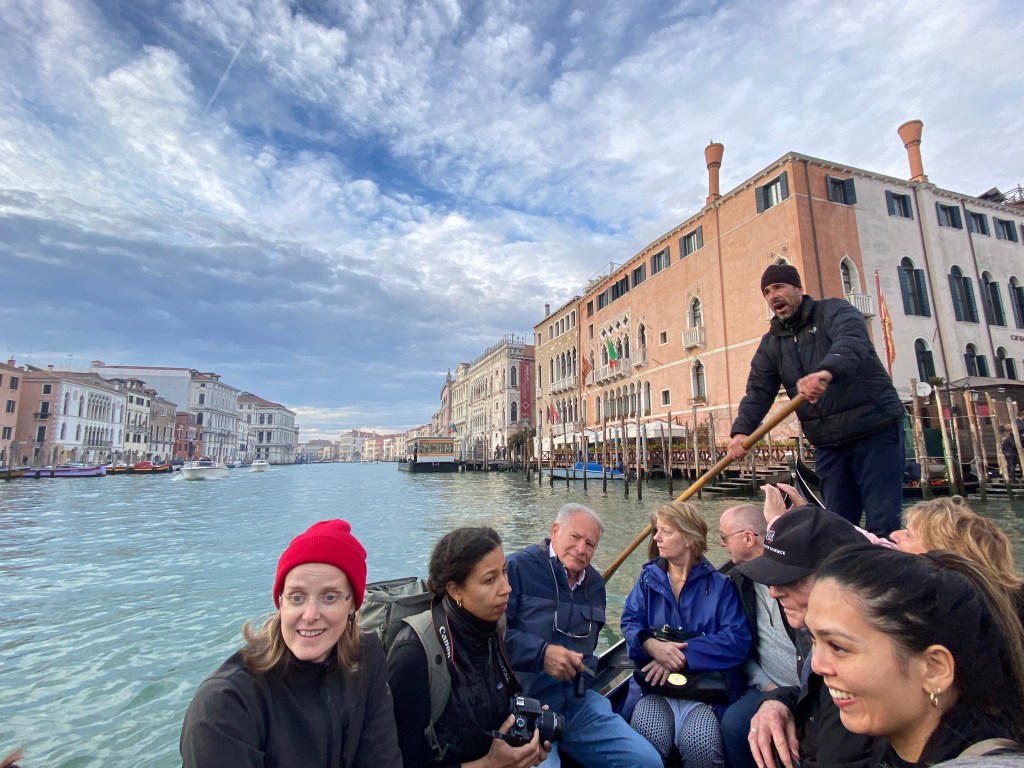 At 2:15pm I met up with two of my fellow cruise passengers (arranged via Messenger) and 10 strangers for my Backstreets of Venice tour. Francesco is a local with a love of the city and a strong antipathy of mass market tourism who subcontracts with GuruWalks. His tour led us through the Jewish Ghetto (1st in Europe), past old and new churches, a traghetto hop across the Grand Canal, along the closing Rialto fish/vegetable market, a 30 minute glass of wine respite, snaking thru the narrowest of alleys (measured in centimeters!) to try to shock us with tales of the underbelly of the city, past my Frari church to end with the World’s Largest canvas mural. It was educational, eye-opening, and by the end, rather exhausting! My mates and I agreed we were too tired and cold to worry about dinner plans so I threaded my way back to the bus stazione to head home to my aparthotel and restorative glass of vino.