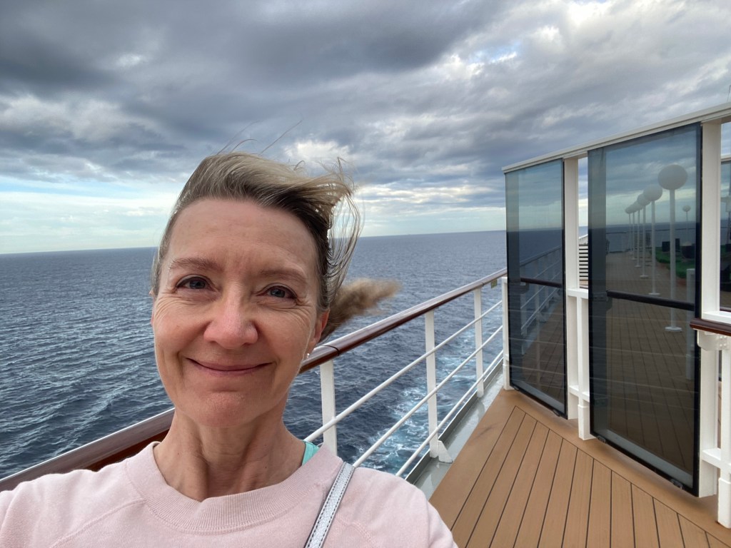But I also awoke to dark skies and strong winds. I attempted a few laps around the top deck but it was really too much effort so I took to the ship’s staircases and hallways. Even with a smaller ship like this it doesn’t take long to rack up a mile or two. For instance, it’s 300 steps for me just to get coffee in the morning!