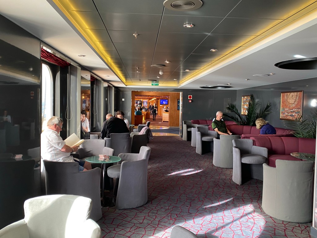 During the day the comfy club chairs in the many bars on board become popular reading nooks and since we’re narrow enough light pours in from big picture windows on both sides of the ship which make it quite pleasant. Again I’m spoiled with my cabin as I have a sofa and chair in which to read in privacy if I choose.