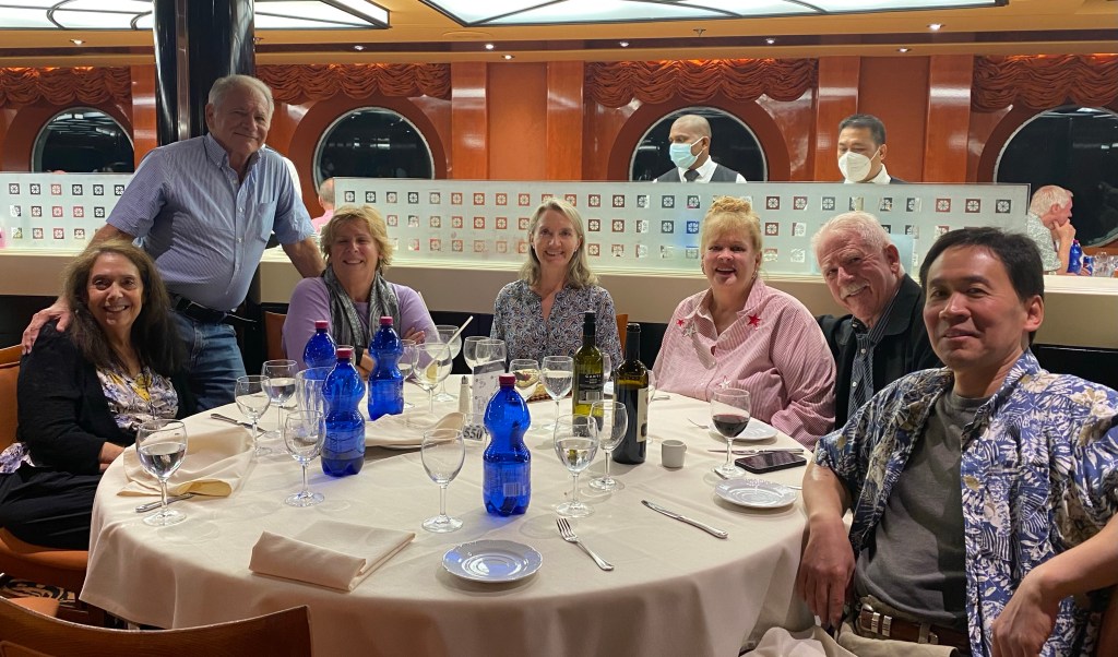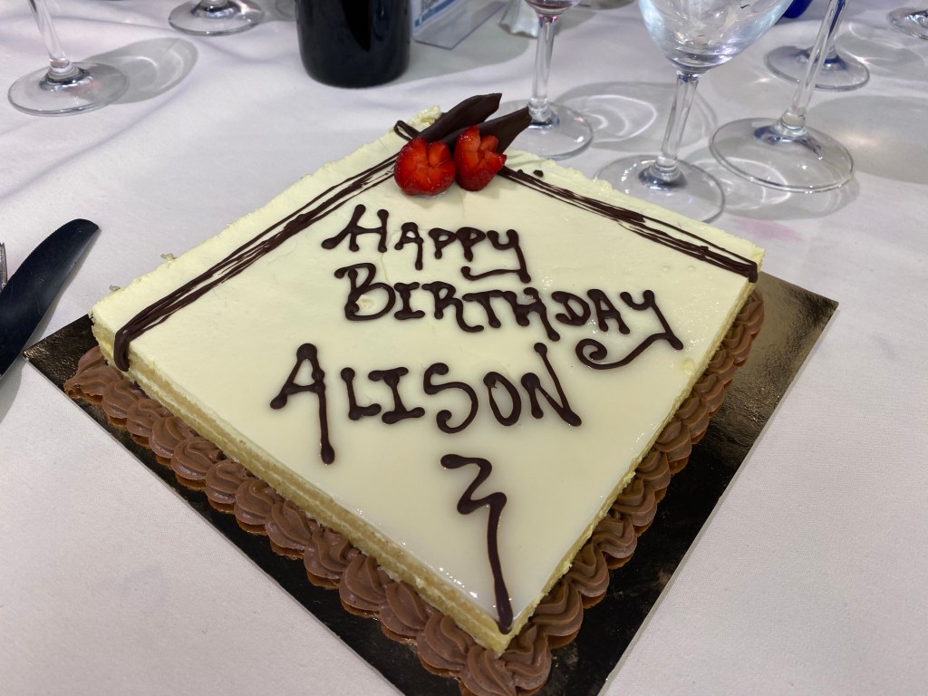 I’m not sure if it was my BC friends to whom I let it slip earlier that it was my birthday or the ship’s doing but at the end of our dinner a big train of servers singing “Happy Birthday” and carrying a cake made their way to our table. I was rather surprised and I must admit, pleased, at having a little celebration. I even had a birthday card on my bed at turndown.