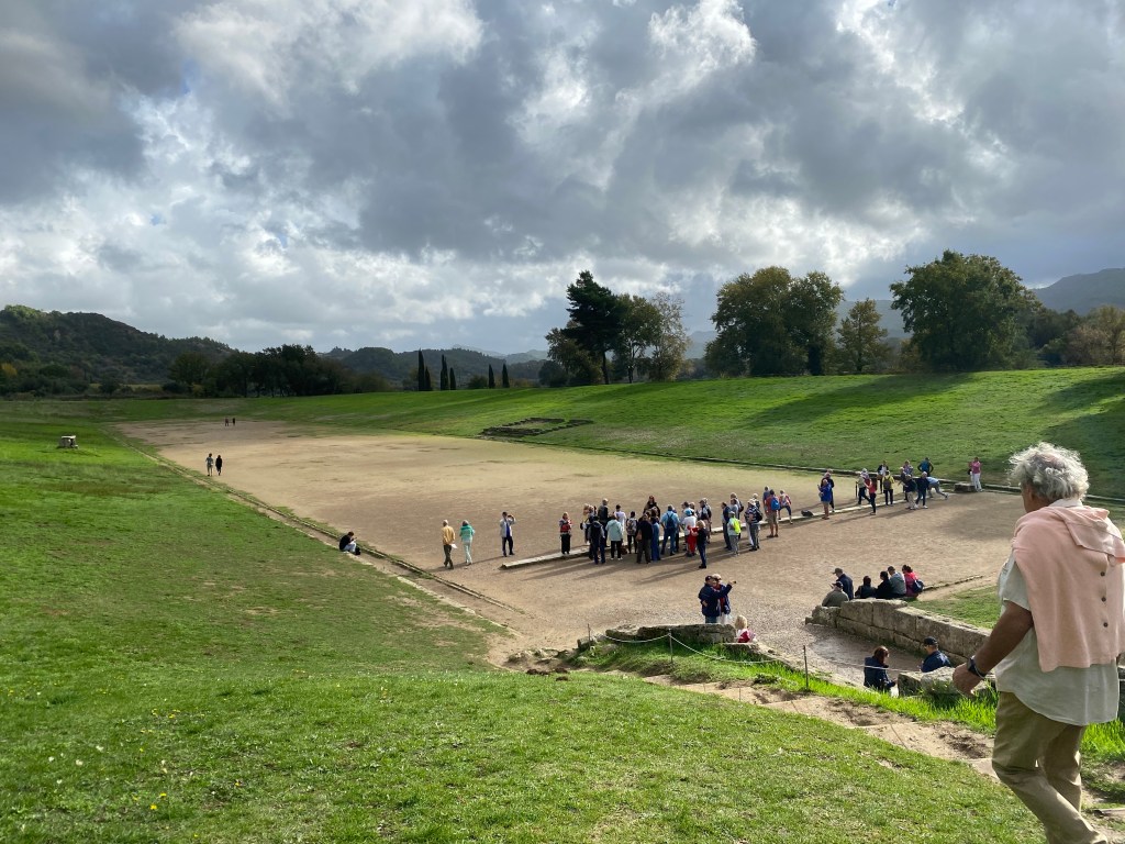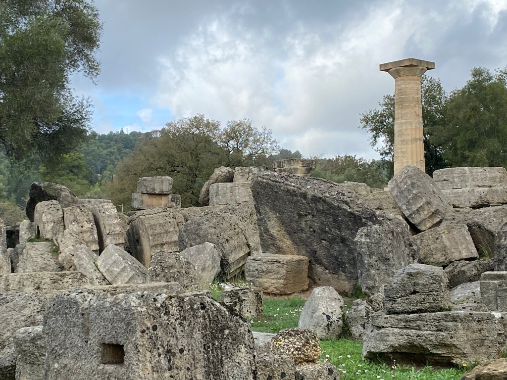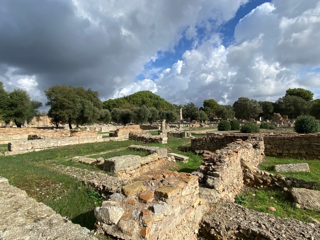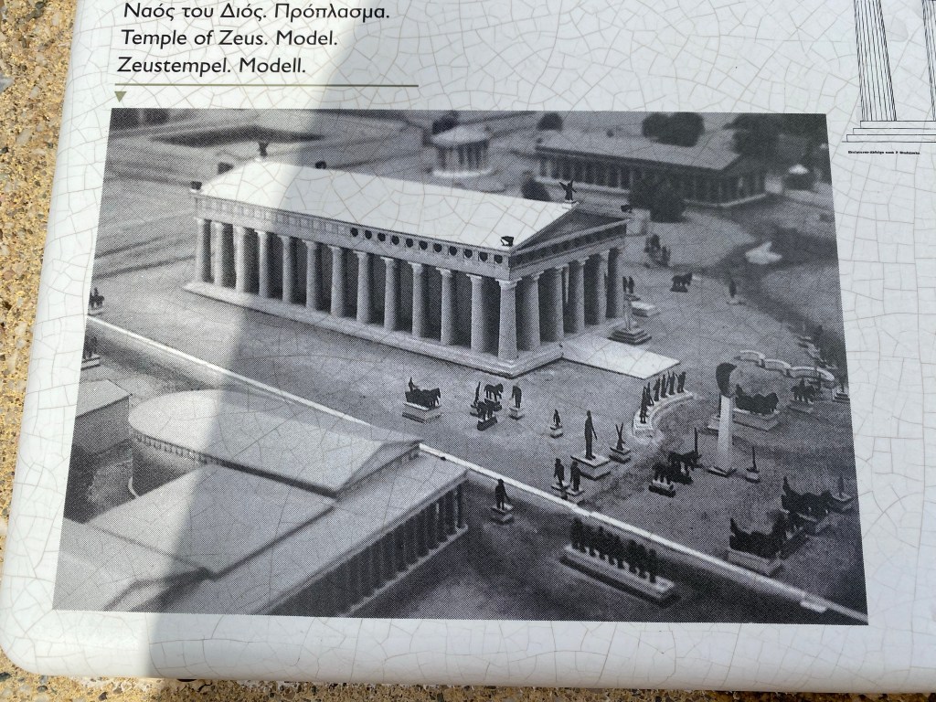 Originally Olympia was a sacred site, as early as the 10th C. B.C. altars were dedicated to the worship of Zeus and Hera (and home in 470 B.C. to a Seventh Wonder of The World – a huge gold & ivory statue of Zeus). Over time temples, and treasuries, and sports facilities, and training sites, and hostels, and minor temples, and communal baths, and stadiums, etc, etc were built creating a huge religious and athletic complex.