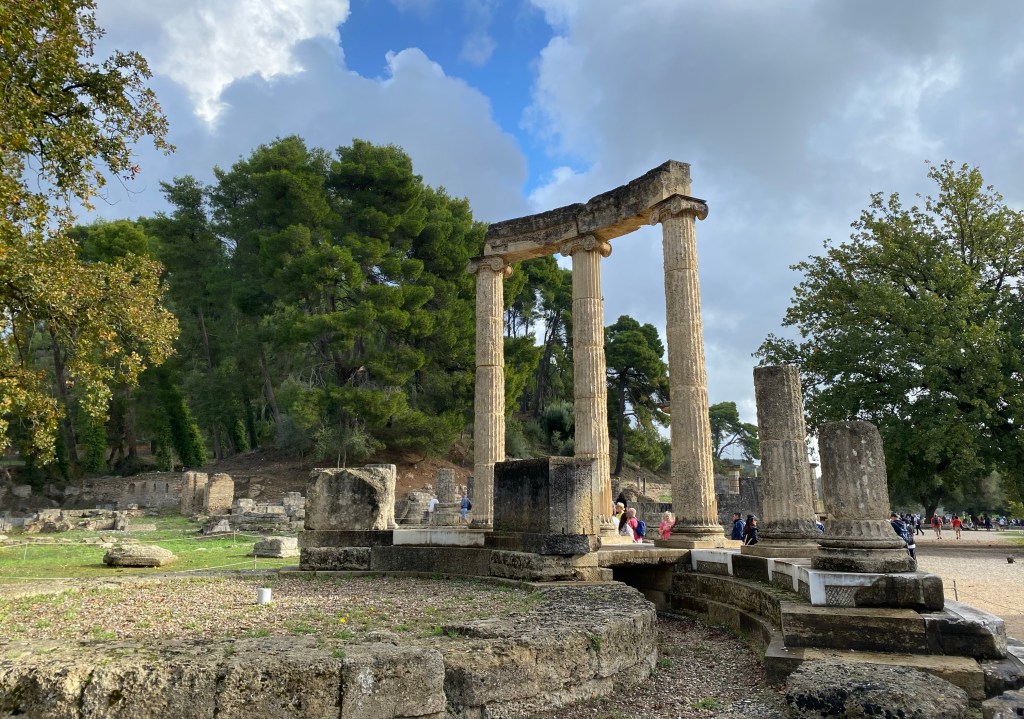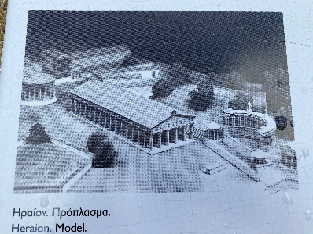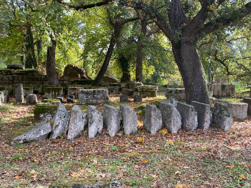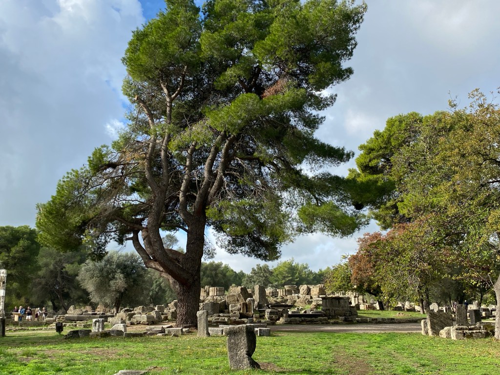 Originally Olympia was a sacred site, as early as the 10th C. B.C. altars were dedicated to the worship of Zeus and Hera (and home in 470 B.C. to a Seventh Wonder of The World – a huge gold & ivory statue of Zeus). Over time temples, and treasuries, and sports facilities, and training sites, and hostels, and minor temples, and communal baths, and stadiums, etc, etc were built creating a huge religious and athletic complex.