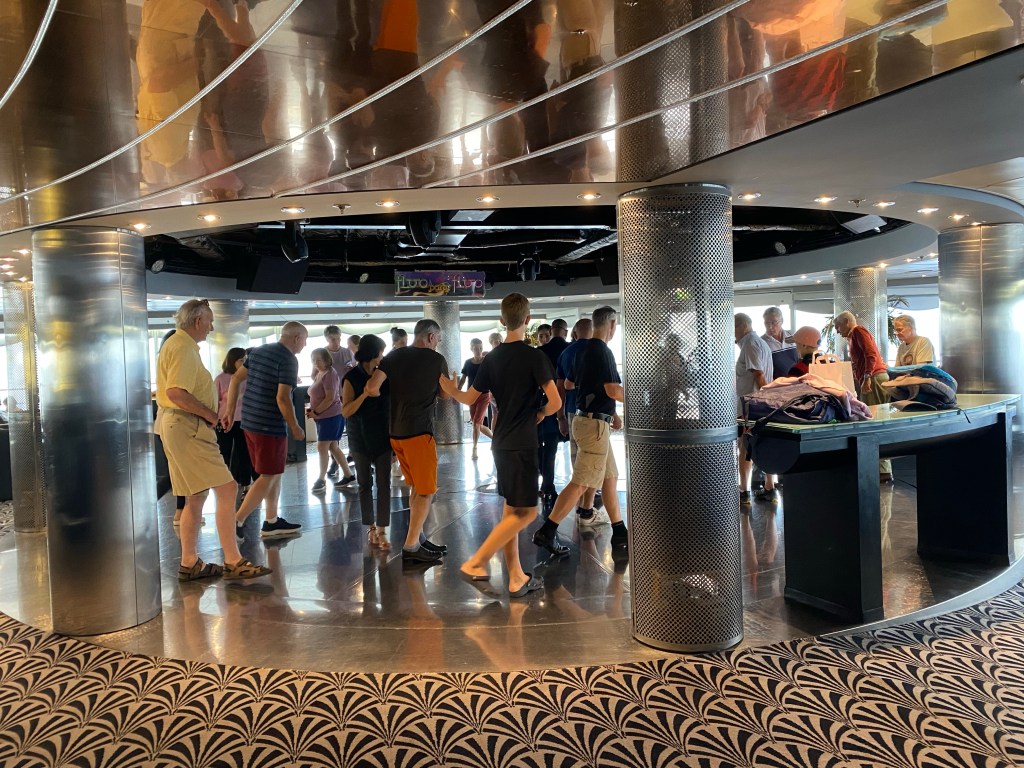 My morning’s exercise was indoors again: each length of the ship takes 3 minutes to walk, so I’ve been doing a full lap, going down a deck, another lap, down a deck, etc, etc, then up 5 flights of stairs, then breakfast. At 9am I hurried off to try Complete Beginners Bridge. As did 60 or so other people. I sat at a random table and soon we were attempting to play cards; just the basic card game, no bidding yet. Unfortunately my partner was a bit tetchy, she had already taken offense when others asked where she was from so when I told her she was The Dummy (I was The Winner of The Bid so her’s was the dummy hand) she got up and walked out!!! Luckily that was near the end of our hour and an Intermediate player sat down and finished our last hand.