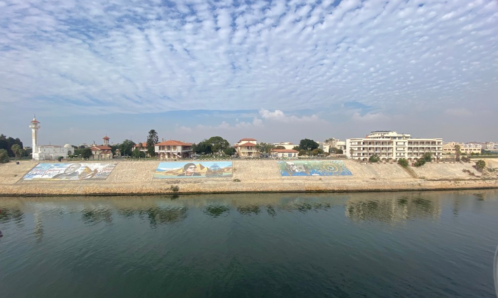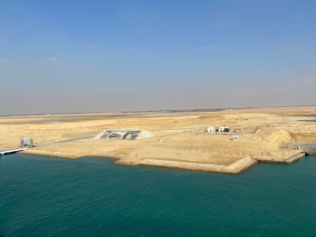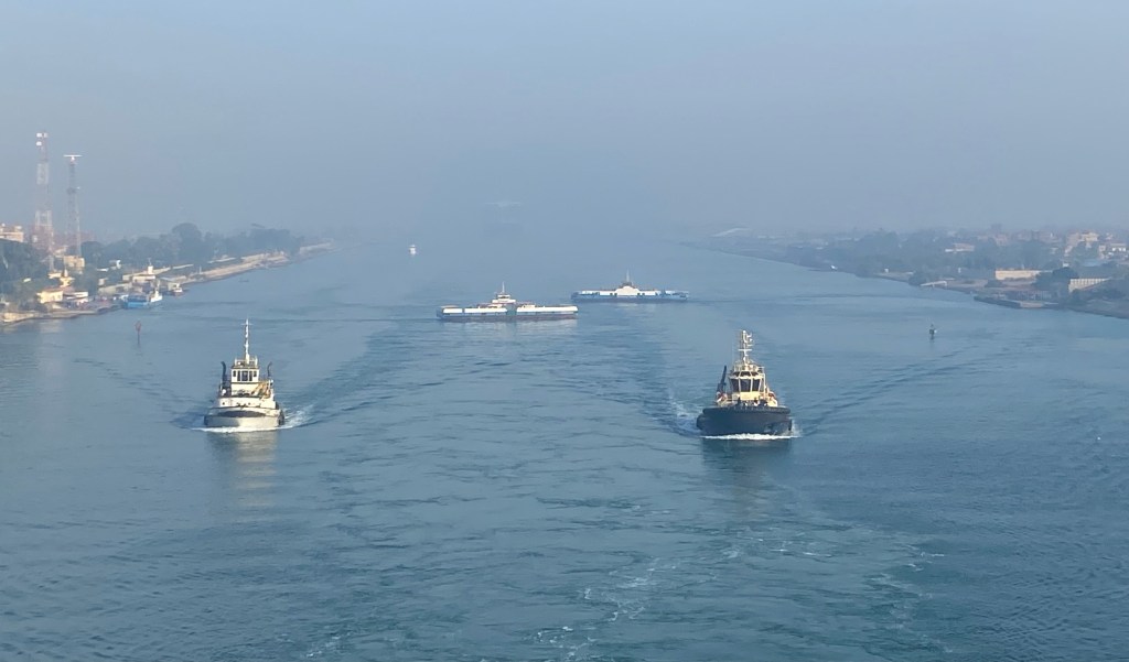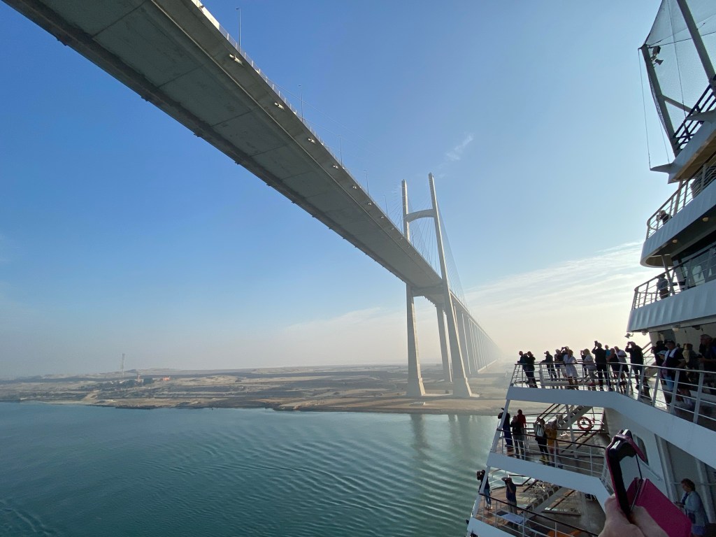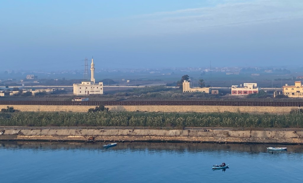6:45am I sprung out of bed, camera in hand, to see what I could see. It was surprisingly chilly and consequently very hazy. The canal is quite narrow, only 180’ wide for much of the top and bottom sections, widening to two lanes of traffic only in the middle. Therefore, not only is traffic reduced to one way a time, the bank of the Egyptian mainland is pretty much right outside my balcony. (I’m on the starboard side of the ship, the port side faces the Sinai bank).