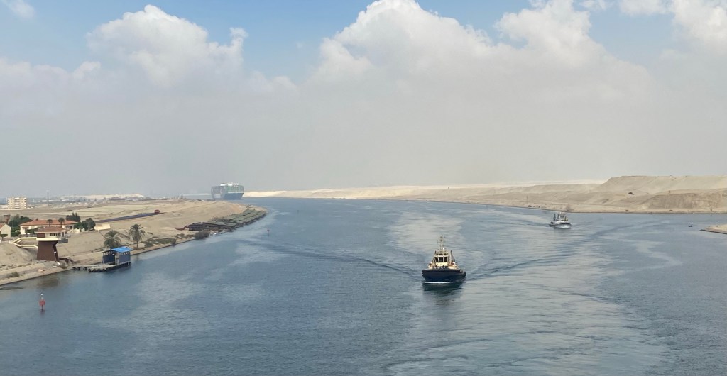 Ships pass through the Canal in a convoy, northbound first (which is probably why we had to wait overnight) then southbound. We’re being followed by a huge Evergreen container ship. You can see in the pic below that the canal has curves and if the wind is really howling I can easily imagine such a big ship being pushed sideways. In the middle bit it widens into two canals and there are cut-thrus where the tugs can help other ships in the convoy go around the grounded ship and not block transit completely.