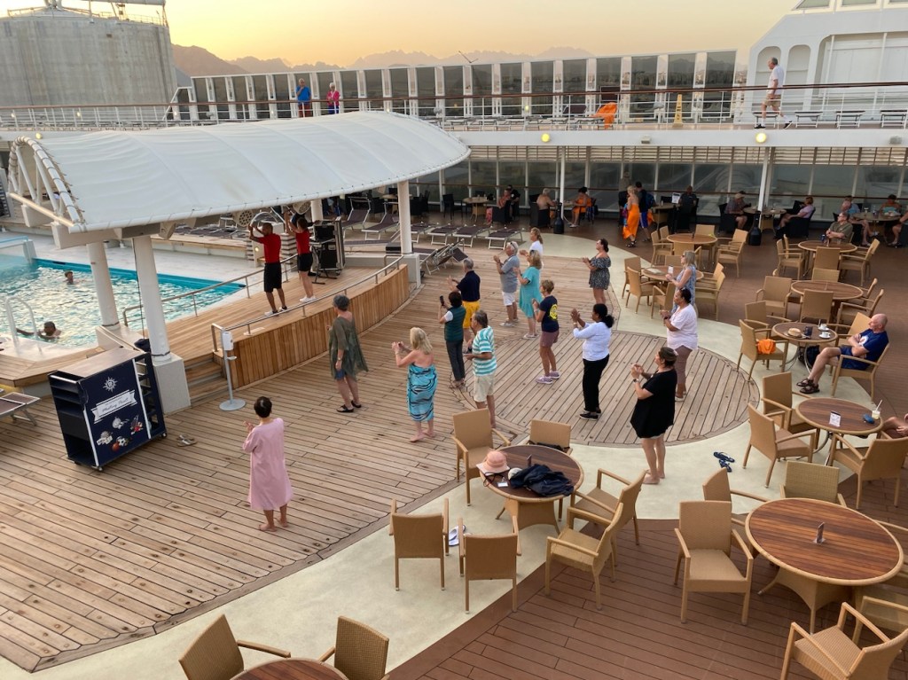 We’re docked in Safaga, Egypt , the port for exploring the ancient city of Luxor and the Valley of the Kings. It’s a 4-hour bus ride each way and that was turn-off enough for me. Fortunately I’d been there before so my backup plan for today was to go quad biking in the desert but I woke up with 1/2 a sore throat this morning – whether from yesterday’s scuba diving or from the cough plaguing fellow passengers, I’m not sure but I decided not to go and just take it easy onboard.