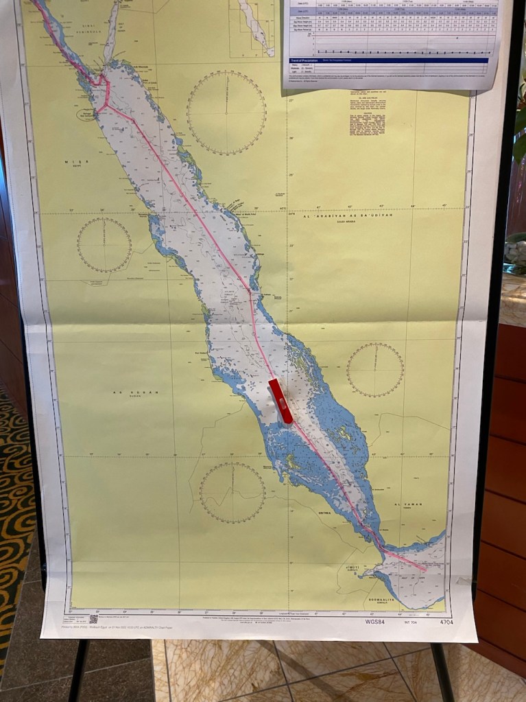 Speaking of ocean voyages (see how I did that? lol) there’s a nautical chart by Reception with a big red boat marking our passage.
