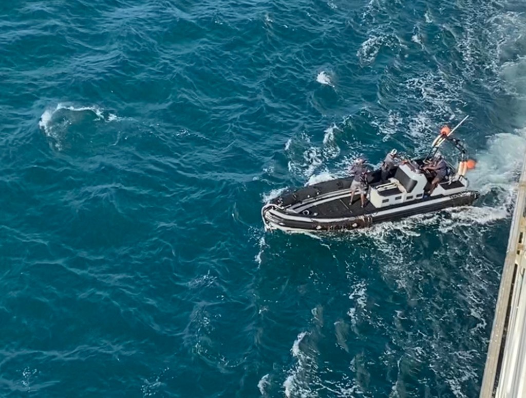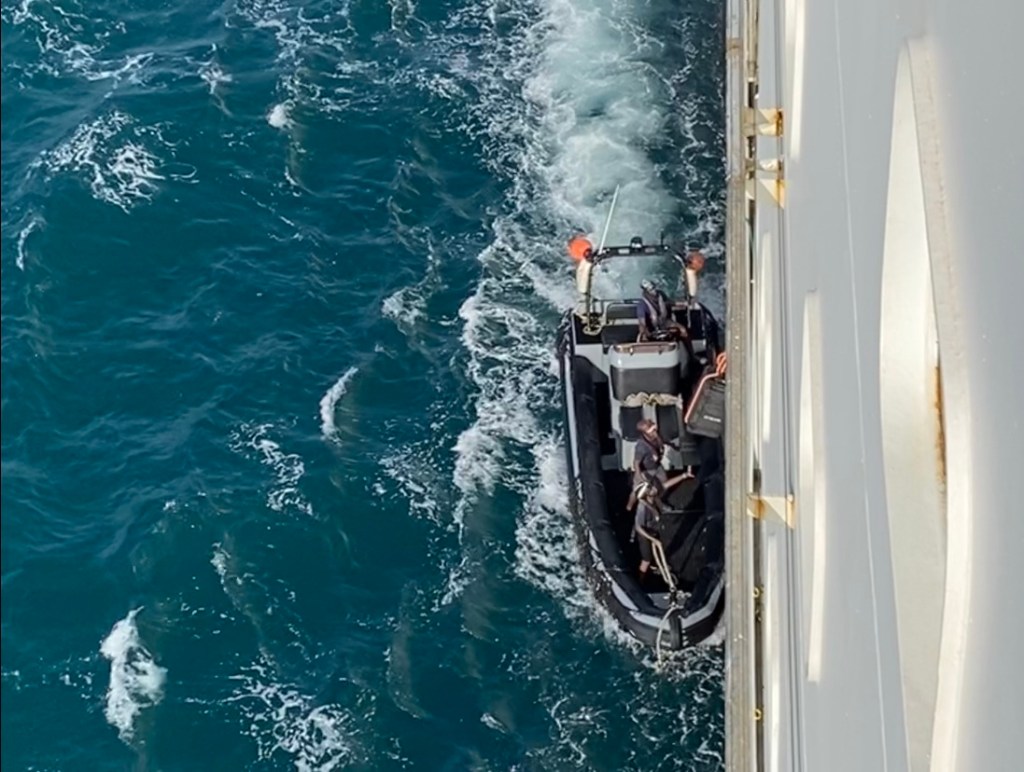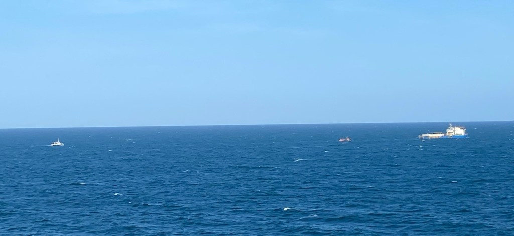 I assumed the captain saw the same so I rushed to the railing instead of the bridge to see what was happening. The little boat came right up to us and went ‘round our stern to the starboard side, the side my cabin is on. So I then rushed to my balcony for these photos: