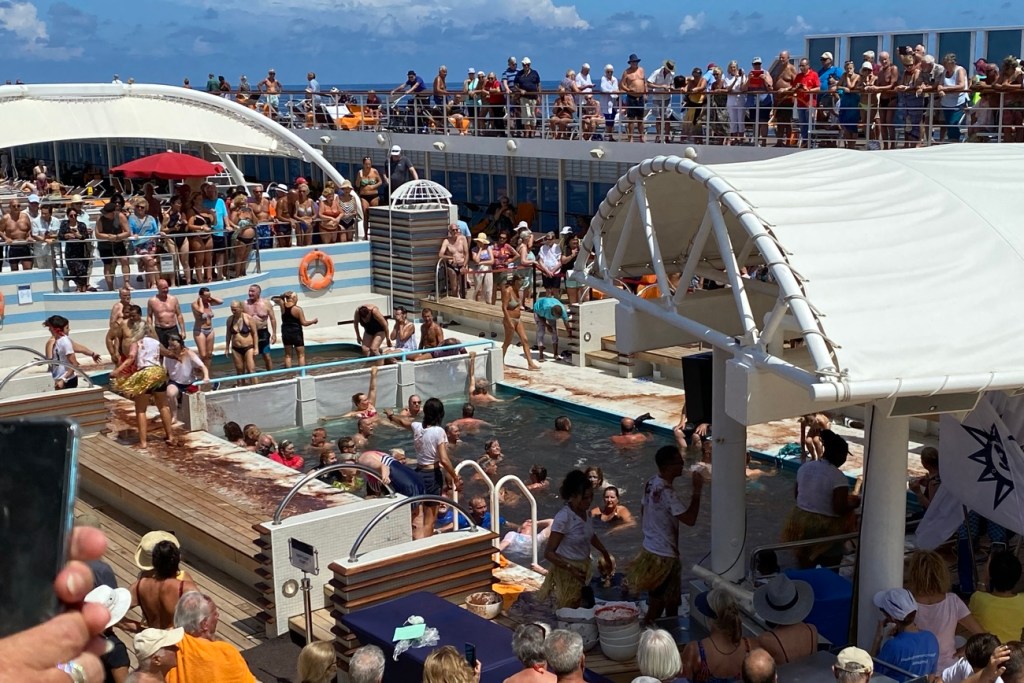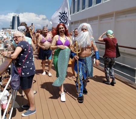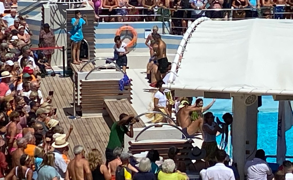 Today, we’ll cross the equator (probably sometime around midnight) but at 11:30a we had a Neptune Party on deck, initiating all the pollywogs into the Having Crossed The Equator Club. King Neptune gave the captain a big gold key, then all the pollywogs had to kiss an octopus (real, btw, tho thoroughly dead), line up along the edge of the pool for their “baptism”. King Neptune ordered the wogs to be splashed with milk (?), then raw eggs, tomatoes, chocolate (how long is this going to go on?). Finally Neptune was happy and all these messy people jumped into the pool. Yuck.