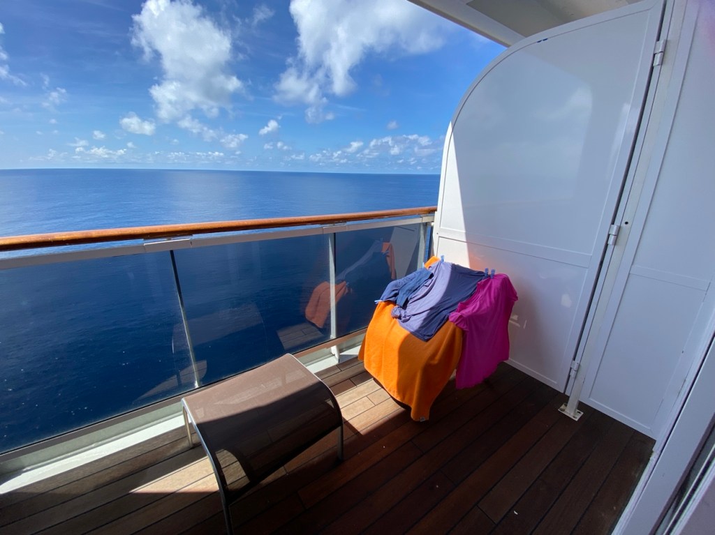No wind to speak of and a lovely little cloud blocking the sun meant walking the deck at sunrise(-ish)! 13.5 laps = 3 miles which is a good start to the day. I’m wandering the ship all day long so I’m going for total miles, not bursts 🙂