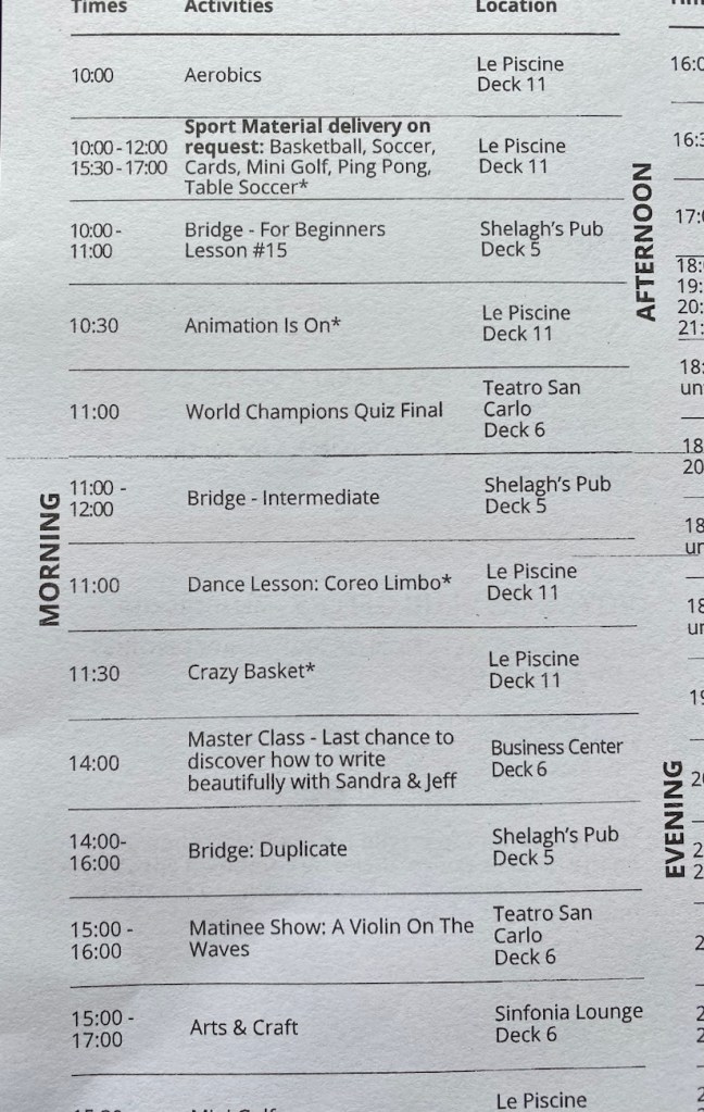 There’s a lack of appealing entertainment options onboard, not even any lectures anymore so unless one wishes to join in on the silly games on the pool deck they’re left to their own devices. For me it’s chasing the internet signal and reading my books. I do love to read so I’m content.