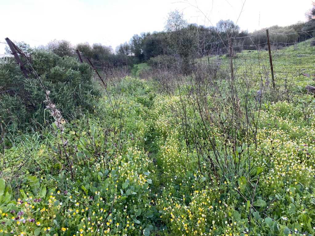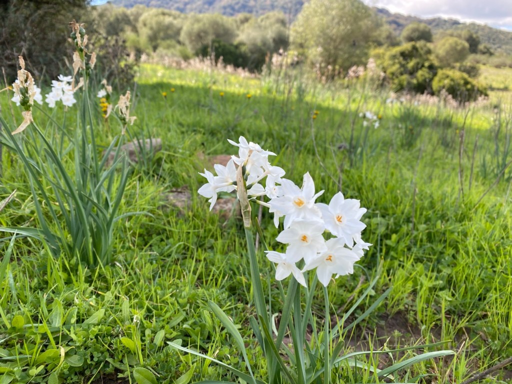 16.5k and I finally met the paved road at the crest of my hill and took it down the far side via a series of tight hairpin bends for a km or two until the route returned to the fields on a steep, treacherous, rocky, muddy trail blissfully strewn with tiny daisies, lilies?, daffodils? and dandelions.