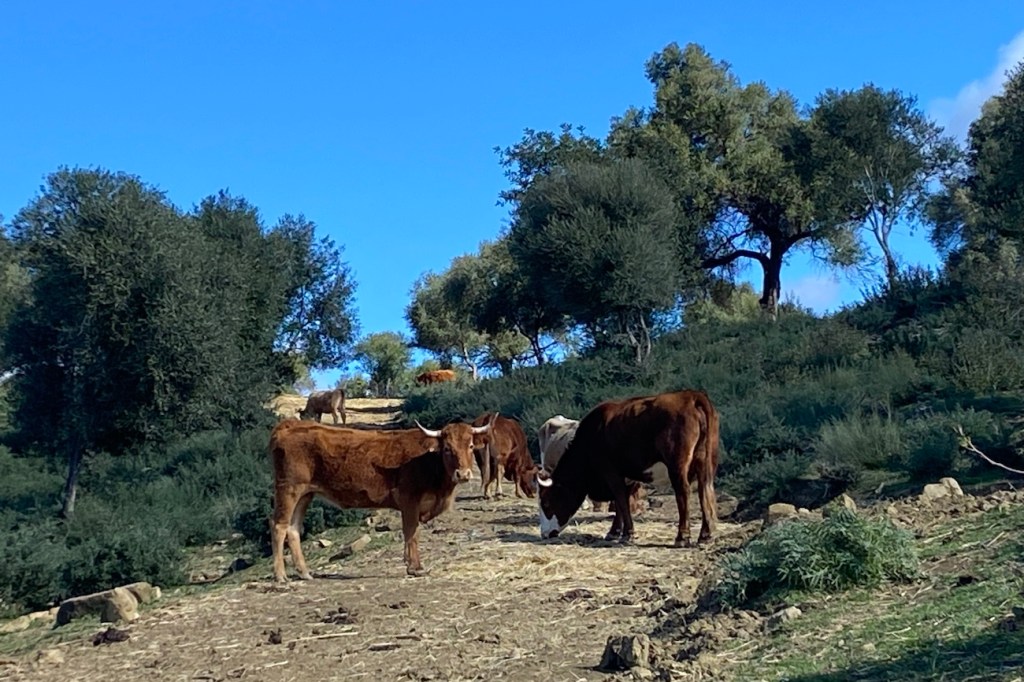 Cows. That’s what was next. Lots of cows chomping on the hay strewn all over the track. Cows with horns and one tiny calf. I let them have the road while I went cross-country around them.