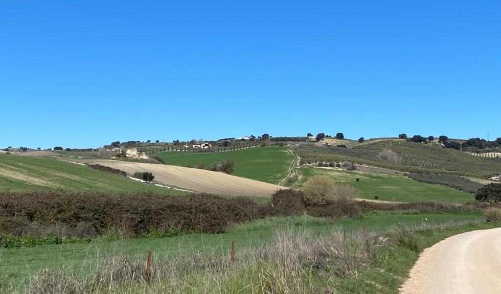The route climbed for a couple miles on hard road, passing dormant vineyards and minor olive farms before, at 9k, turning onto a quieter though still paved road wending down to green cereal fields and still brown furrowed plots.