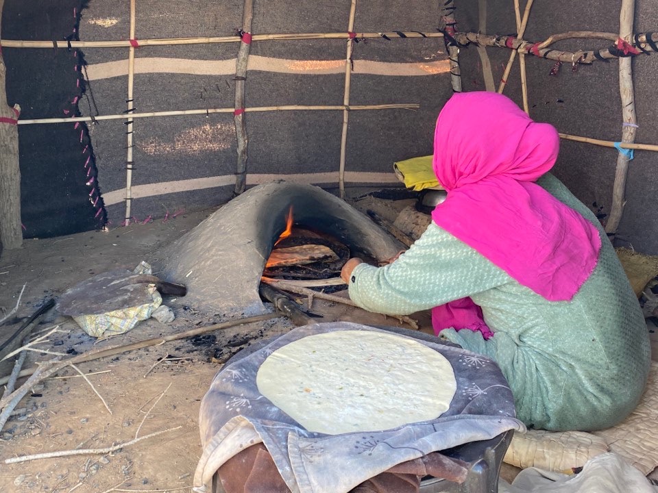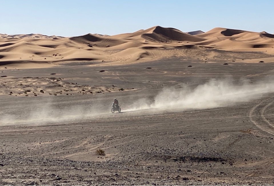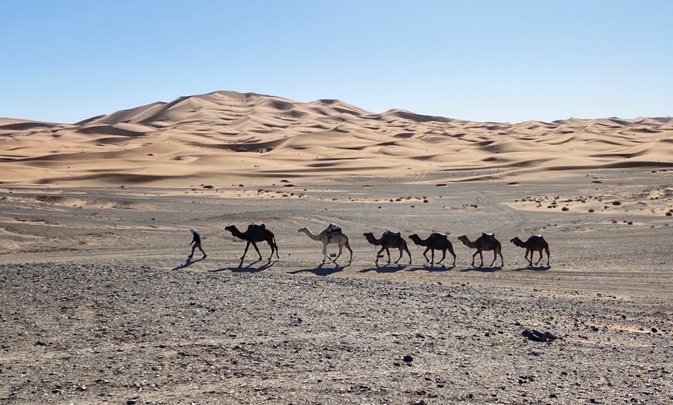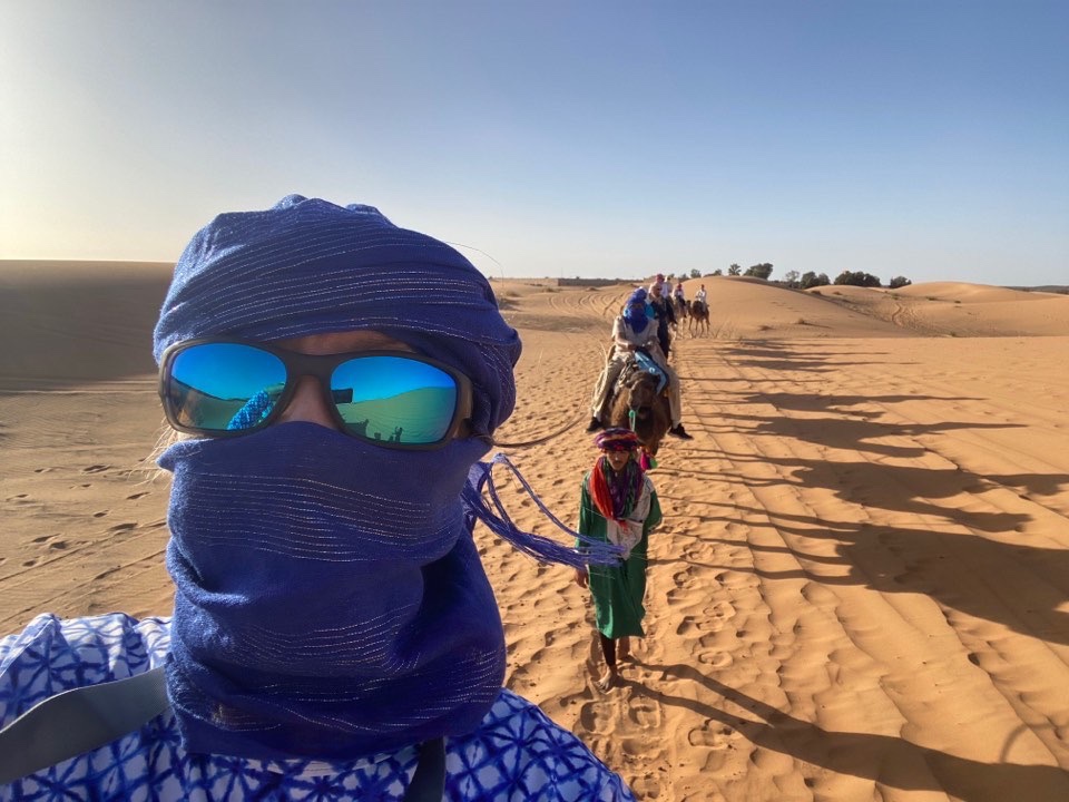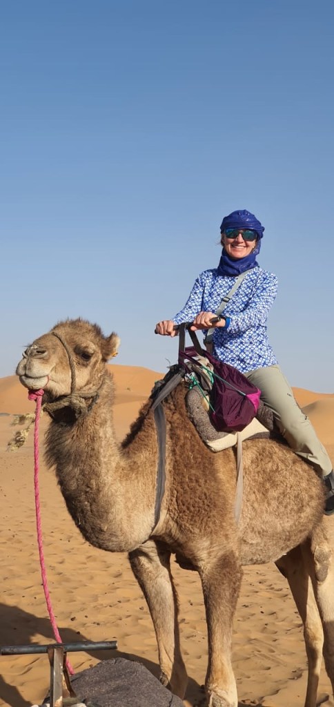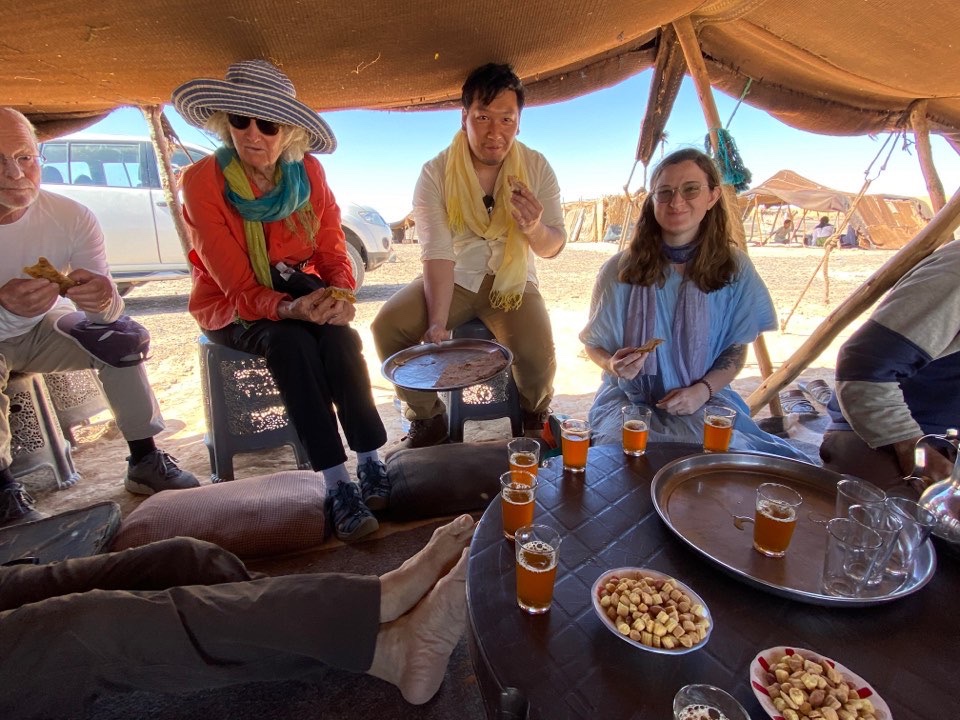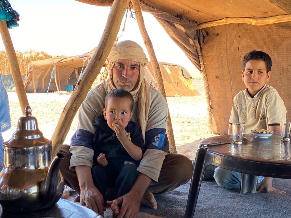 Then we roared, euphemistically speaking, around the western edge of the dunes and south to within sight of the border with Algeria, to visit another nomadic family. Mouna made traditional Berber “pizza” for us (with cheese, chopped onion and tomatoes inside flat bread) and her husband poured us tea. They used to be nomadic, always on the go with their livestock but with 2 young boys they’re semi-permanently based here while the oldest goes to school and the father leads the occasional camel ride.