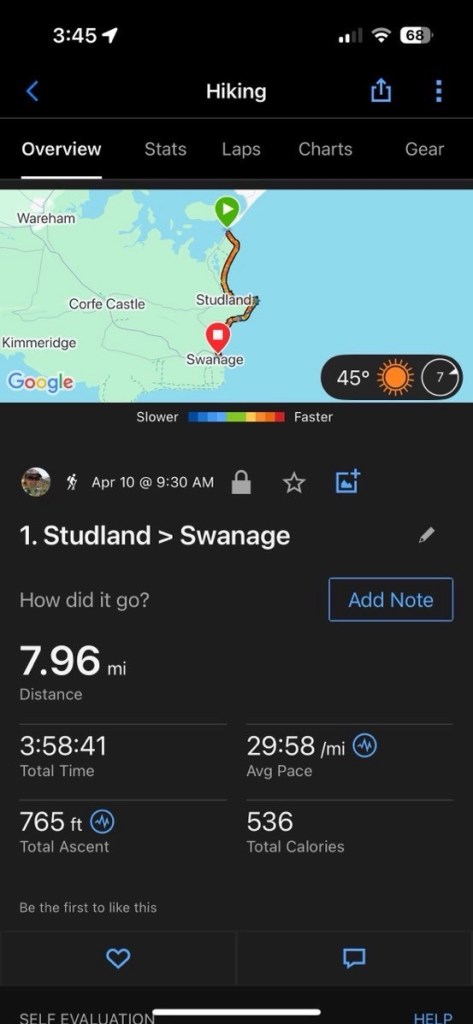 Our first 3 miles were on the beach of Shell Bay and it was turning out to be a glorious day: bright sun, cool breeze, and easy walking. We had to detour inland at the end and walked a combo of country lanes and open headland all the way to Swanage. A great 1st day!