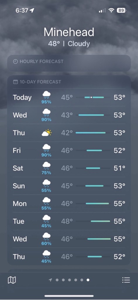 Minehead’s much larger than I expected. It’s a seaside town with a huge bay and a working passenger/tourist steam train. The Main Street was full of interesting shops and restaurants but the rain started again so I just headed along the bay for the 20 minute walk to my hotel.