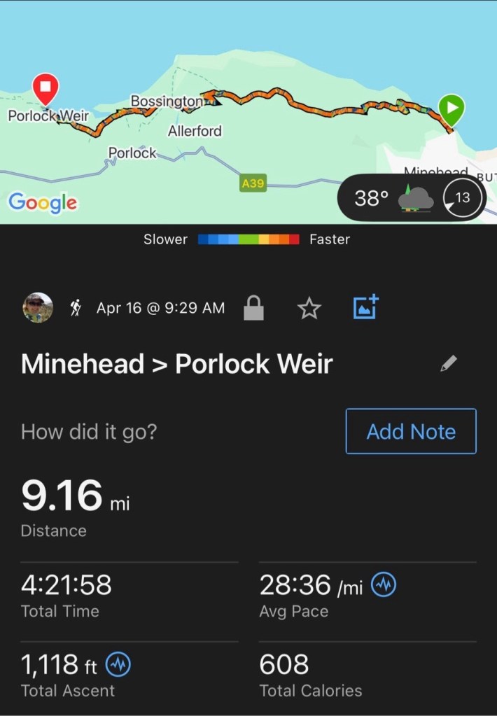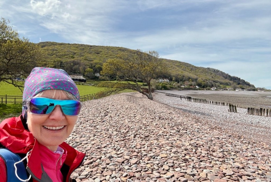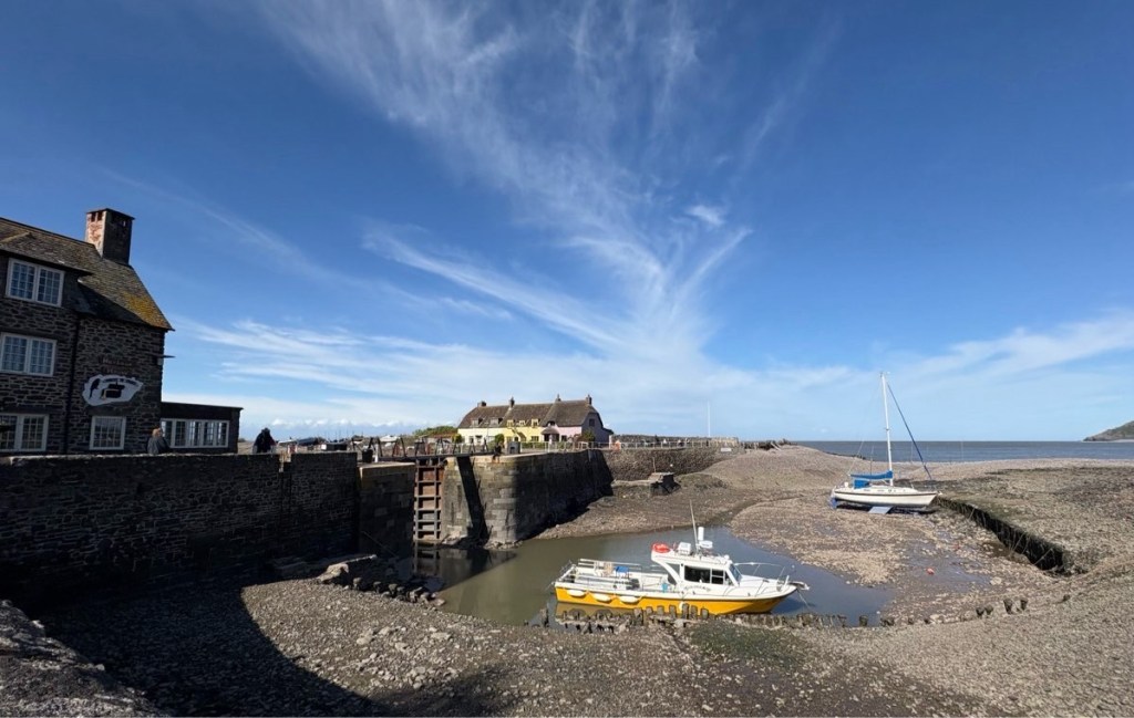 A pleasant descent down thru the trees, then a never-ending 3 miles along the marsh and stoney beach to Porlock Weir. I mean this literally: I saw signs stating 3m, then 2.5m, then 3m again, then 1 3/4m, then 2m, and so on!