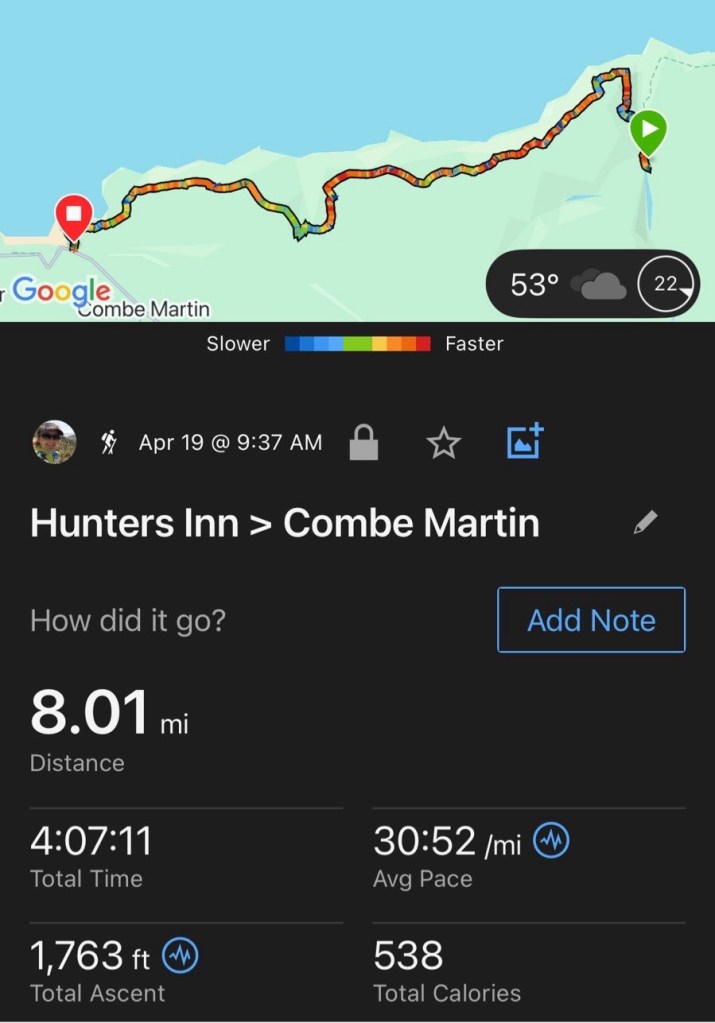 After a short rest I was off to tackle Great Hangman, the highest point of the whole South West Coast Path. Switchbacks! And a decent grade going up! Finally!! Then a descent down past Little Hangman and into Combe Martin.
