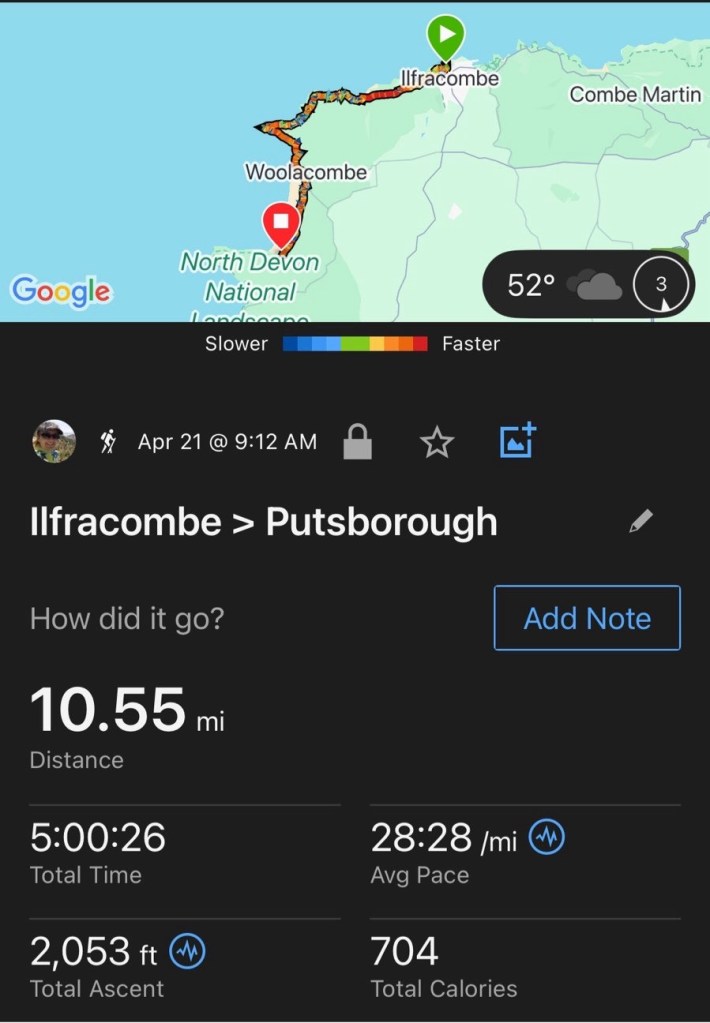 I finished at the far end of the beach at Putsborough where Sophie, my host for the next two nights, picked me up to bring me back to her BnB in Braunton. She’ll feed me dinner and drop me off where I finished in the morning.