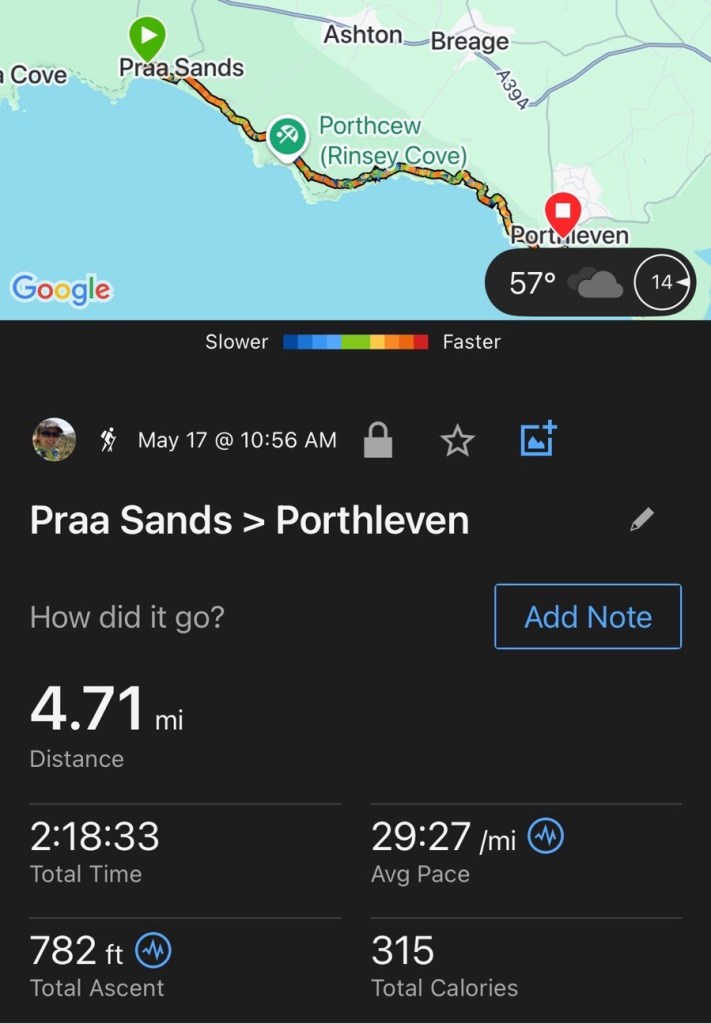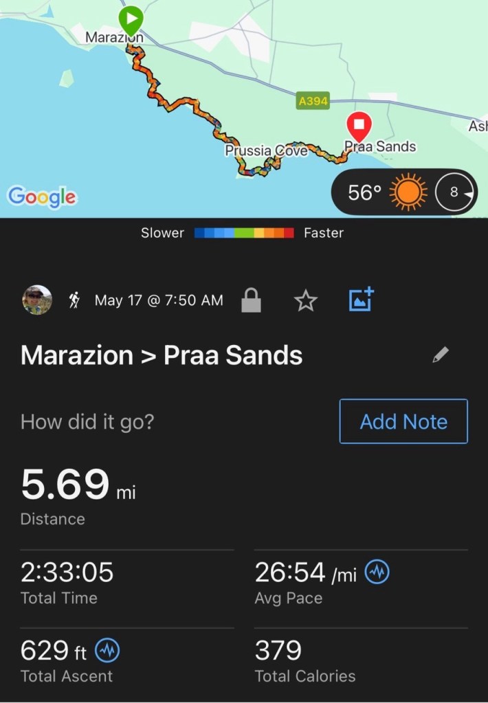 I reached Praa Sands at 5.7 miles and decided it was time for a beachside coffee break. Being a Saturday there were lots of people about, even swimming and kayaking (again in wetsuits). Cold water is no deterrent!