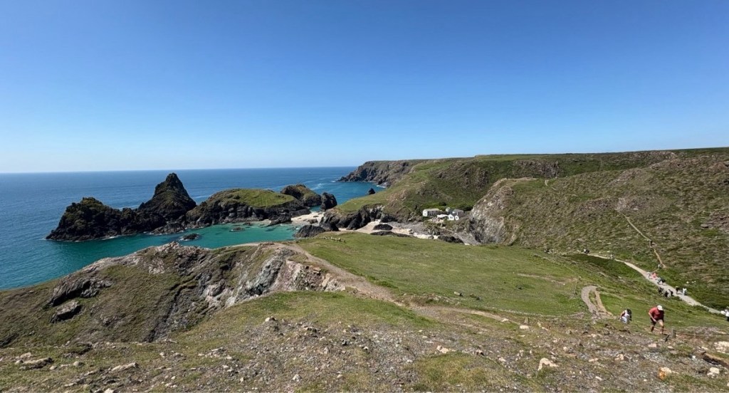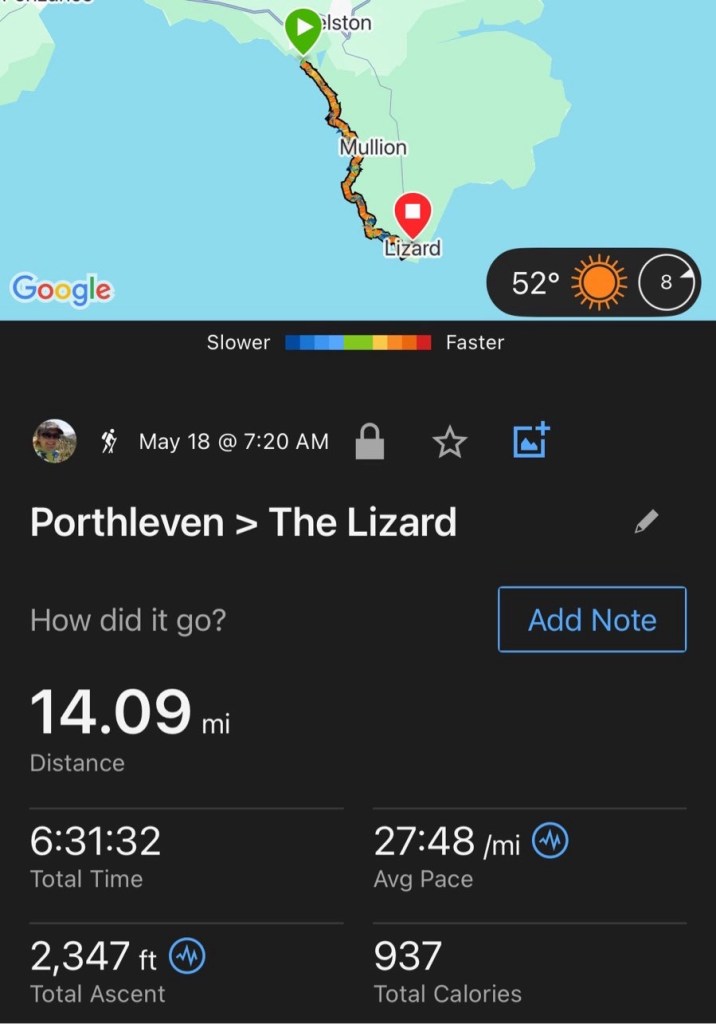 Whew! One more little narrow valley and it’s \ + / and a stretch along the fields of the western side of the point and I made it to the Lizard. As predicted, it was a big day but pretty easy walking with bits of cardio thrown in. 😅