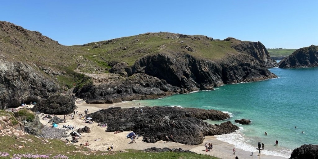 At 12 miles I reached the incredible Kynance Cove with its jagged islets, turquoise waters, and beach that looks like it belongs in Greece. Being a Sunday it was heaving with people so I quickly crossed the stoney beach in the 2nd picture and climbed up out of the crowds.