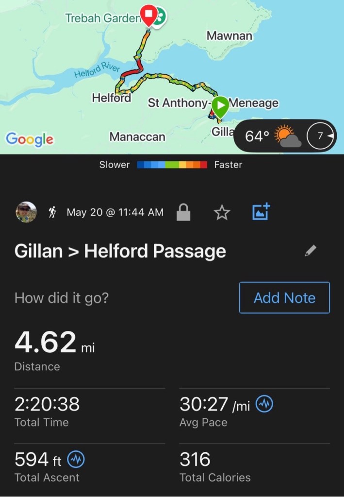 Today I walked 8a-2p again, and am done in. The difference? My walk ended at the wonderful Trebah Gardens (and Cafe!) so strolled that for 2 hours (and 2 more miles), then once in Falmouth it was another mile to my hotel, arriving at 6p. Not overly huge mileage but boy, dragging out the day till dinner time exhausted me.