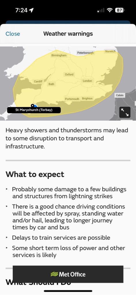 7am: I’ve been watching the weather since yesterday afternoon. There’s a Yellow Flag warning for my area with possibility of severe thunderstorms and localized torrential rain. My first section is rated strenuous with several very steep, grassy climbs and cliff edge walking, an estimated duration of 4+ hrs, and no villages/services en route. Based on my last experience walking during a gale I’ve decided to be prudent and take the bus over those 6 miles, then try the next 9 miles which are more urban with a train running alongside (= escape route).