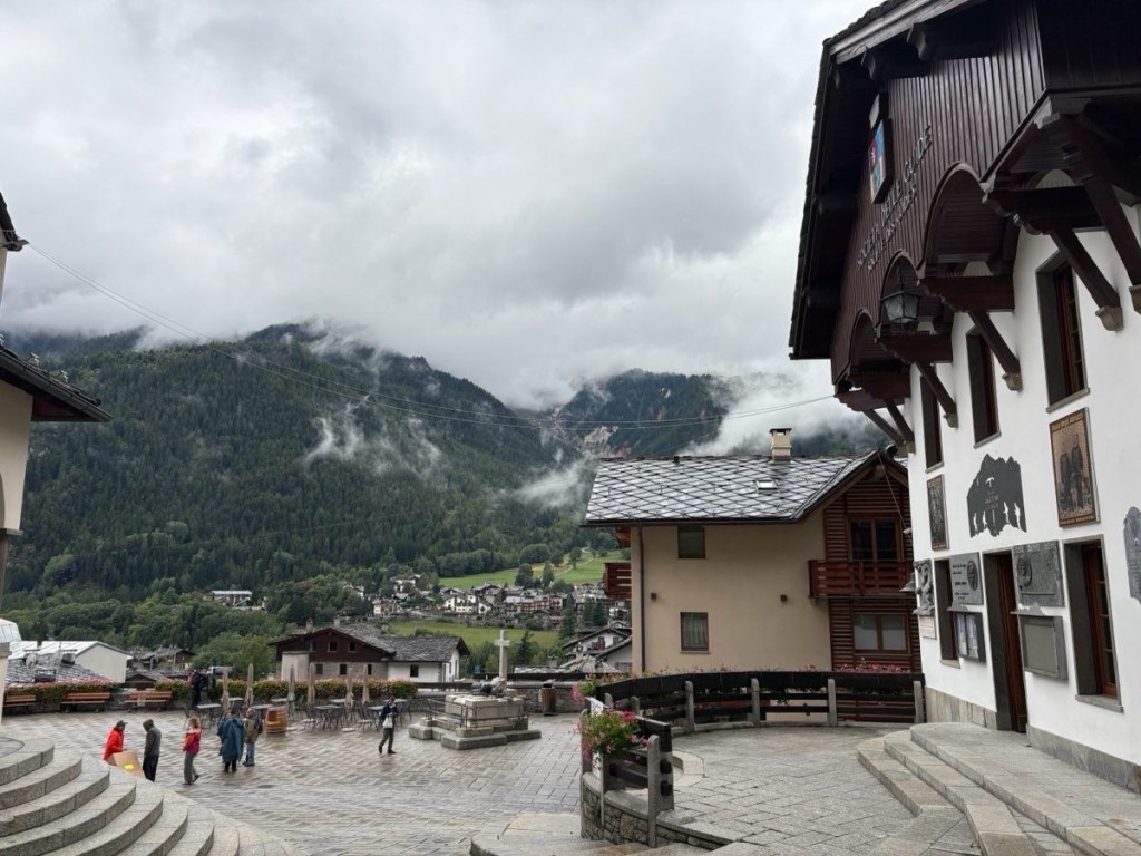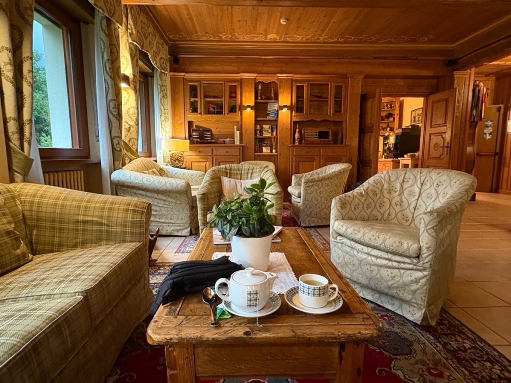 A rest day today and what timing! Thunderstorms during the night and it’s absolutely tipping down with rain this morning. The mountains which hug this valley town are shrouded in mist – not a view to be had anywhere. My room at the Hotel Croux is another perfect single – with a huge balcony which me and my wet laundry fully utilized yesterday’s sunny afternoon. This morning I’m taking advantage of the cozy reception lounge to while away a few hours with tea and a good book before venturing out later for food. Can’t be more restful than that!