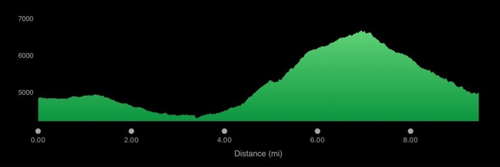 @ 5 miles I hit a plateau where I caught a glimpse of a view (and my breath) before the heavy mist/rain socked in again (and the trail climbed again).