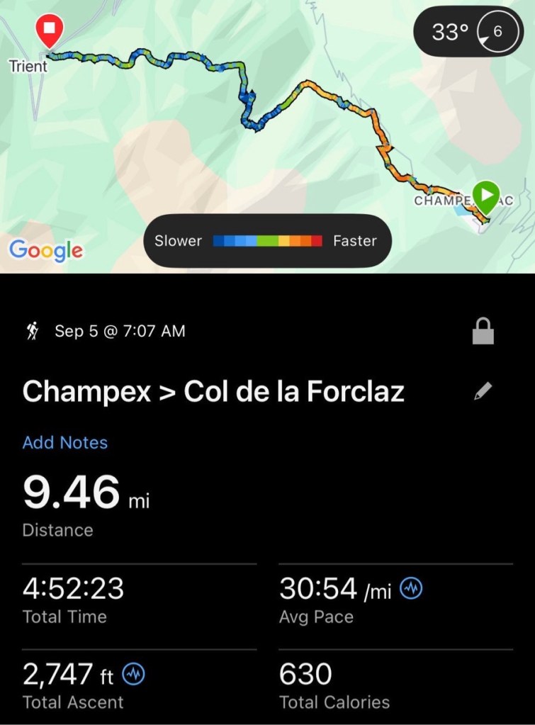 Until I reached 6.5 miles & 3h10m, pushing through without a break with the goal of a nice hot drink at Alpage de Bovine. The whole way I was judging how fast I went, how long I could break for, how long till the bus. “Ferme”. Closed. The worst word for a weary hiker to come across. No cappuccino, no blueberry pie ;-( So I sat on a rock in the sunny rain and ate my granola bar.