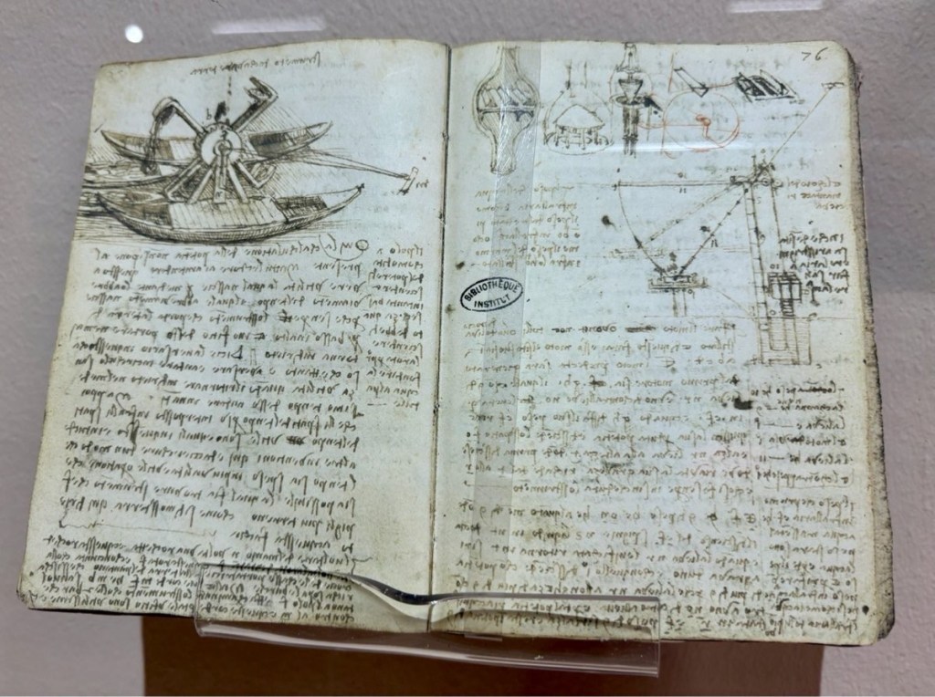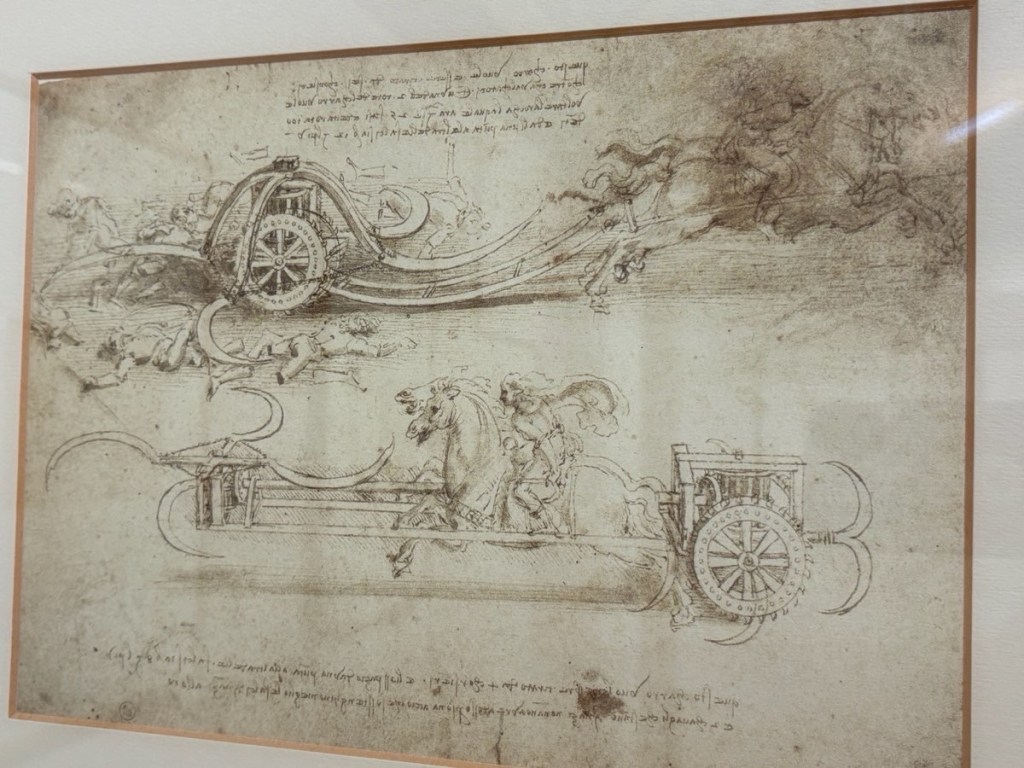 Thinking I’d seen it all, I looked out a glass door a man was cleaning to discover a large tranquil sculpture garden, a quiet cafe, excavated Roman walls, and another building housing a photo exhibition + a Da Vinci display of copies of his drawings, a few original notebooks (!), and mini models of his inventions.
