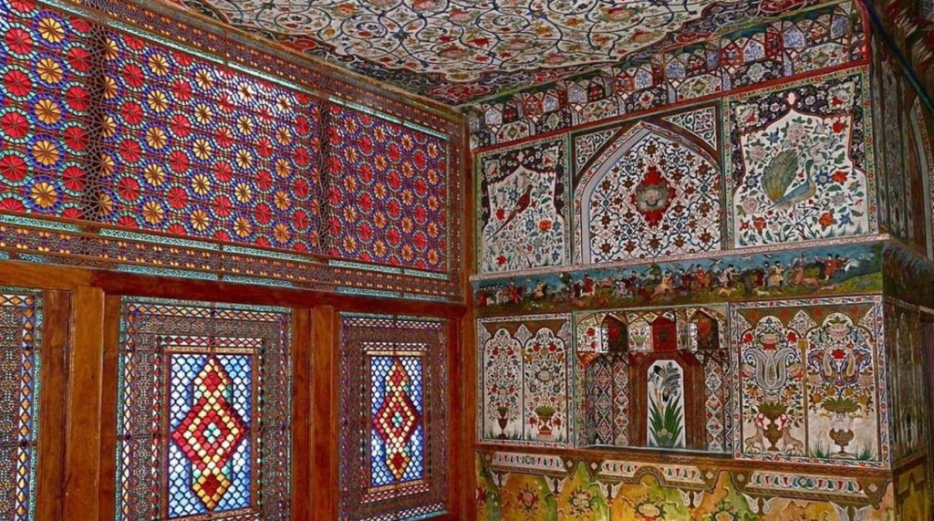 Next we bused up to the Summer Palace of Sheki Khans. Built in 1765, it is not actually a residence but a 4 room showpiece that was used for ceremonial purposes and governmental receptions. Almost all the rooms save the one used by scribes for their secretarial work are completely covered in elaborate painting; mostly floral, animal and geometric design, with the Ruler’s conference room showing macho scenes of hunting and war. All rooms have their southern-facing windows covered in fretwork screens with murano glass which on sunny days would create kaleidoscopes of colors inside. (No photography allowed so I snatched these interior pictures from the internet).