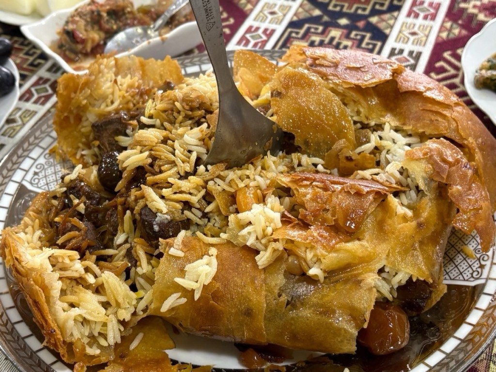 A special lunch was in store for us next: Shakh Plov, the national dish of Azerbaijan. The name translates to “King Pilaf” because it is a majestic and highly festive dish, often served at weddings and celebrations. It’s made with saffron rice, chestnuts, apricots, prunes, and beef, wrapped in layers of buttery lavash (like phyllo) and baked ~4 hours till cooked and crispy. It was another feast!